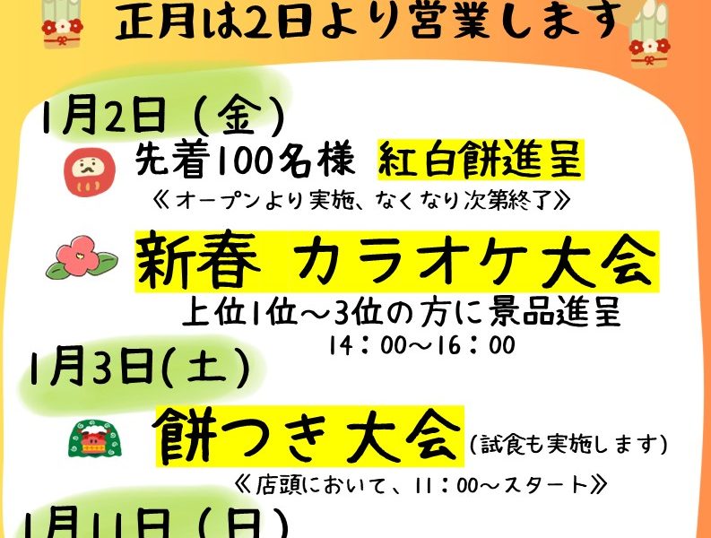 加盟店からのお知らせ お正月イベント 2025.12.23 この記事のタイトルとURLをコピーする お正月はイベント盛りだくさん!紅白餅進呈や新春カラオケ、餅つき大会開催。1月2日より営業!先着特典あり家族でどうぞ♪♪♪ ご予約は、☎ 0555-25-3000まで! 西桂町商業部会公式アカウント LINE友だち募集中! 投稿者: 三ッ峠グリーンセンター 加盟店からのお知らせ, 三ッ峠グリーンセンター, 西桂のこれイイネ! ひと足早いクリスマス! 前の記事 第315回にしの市12月 次の記事