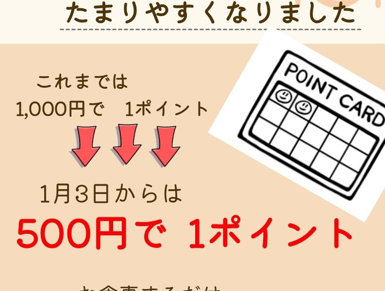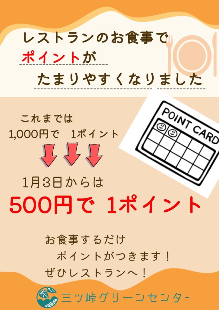 加盟店からのお知らせ 「ポイント」がたまりやすくなりました! 2026.01.07 この記事のタイトルとURLをコピーする レストランのポイントが変更に。2026年1月3日からは500円で1ポイント。お食事するだけで、今よりお得にたまります! ご予約は、☎ 0555-25-3000まで! 西桂町商業部会公式アカウント LINE友だち募集中! 投稿者: 三ッ峠グリーンセンター 加盟店からのお知らせ, 三ッ峠グリーンセンター, 西桂のこれイイネ! 貸切コテージでパーティーしませんか? 前の記事 2026蔵開き宿泊プラン 次の記事