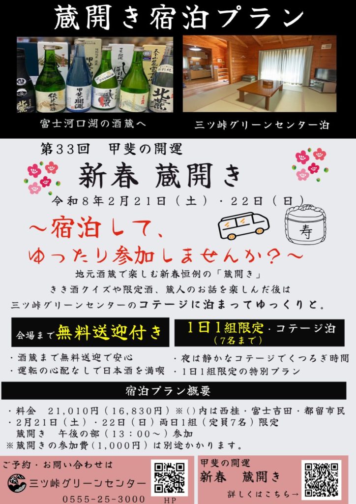 加盟店からのお知らせ 2026蔵開き宿泊プラン 2026.01.08 この記事のタイトルとURLをコピーする 蔵開きで日本酒を満喫。無料送迎付きで運転不要、心ゆくまで楽しむ新春限定酒旅。 期間:2026年2月21日(土)、22日(日) プラン内容は、チラシをご確認ください。 ご予約は、☎ 0555-25-3000まで! 西桂町商業部会公式アカウント LINE友だち募集中! 投稿者: 三ッ峠グリーンセンター 加盟店からのお知らせ, 三ッ峠グリーンセンター, 西桂のこれイイネ! 「ポイント」がたまりやすくなりました! 前の記事