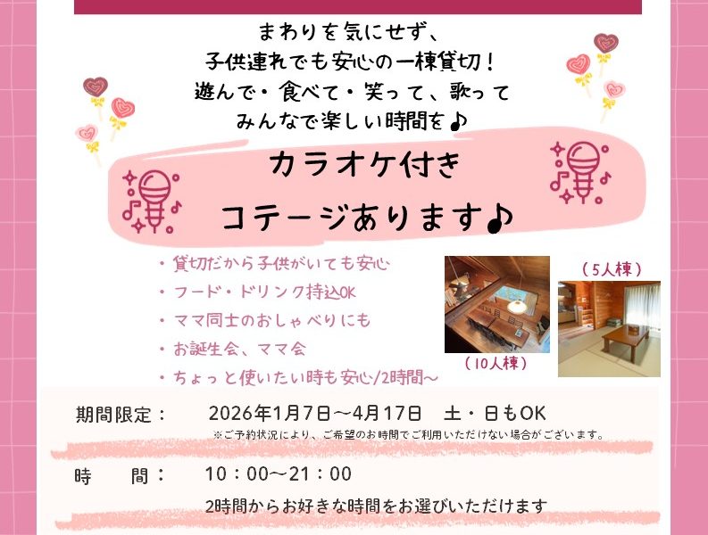 ママも子供も一緒に楽しめる貸切コテージ。2時間〜OK。カラオケ付きコテージ有で誕生日会やママ会におすすめ♬