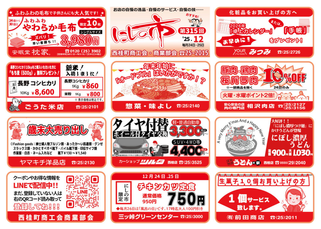 にしの市 第315回にしの市12月 2025.12.24 この記事のタイトルとURLをコピーする にしの市チラシ 売り出し加盟店 みつみ 相沢肉店 安眠堂枕家 惣菜・味よし ヤマキチ洋品店 ツルタ うどんの駅 ごうた米店 三ツ峠グリーンセンターツ 前田商店 お店の自慢の逸品・自慢のサービス・自慢の技、加盟店でのご利用をお待ちしております。 西桂町商業部会公式アカウント LINE友だち募集中! 投稿者: 商業部会 にしの市, 商業部会からおしらせ お正月イベント 前の記事 貸切コテージでパーティーしませんか? 次の記事
